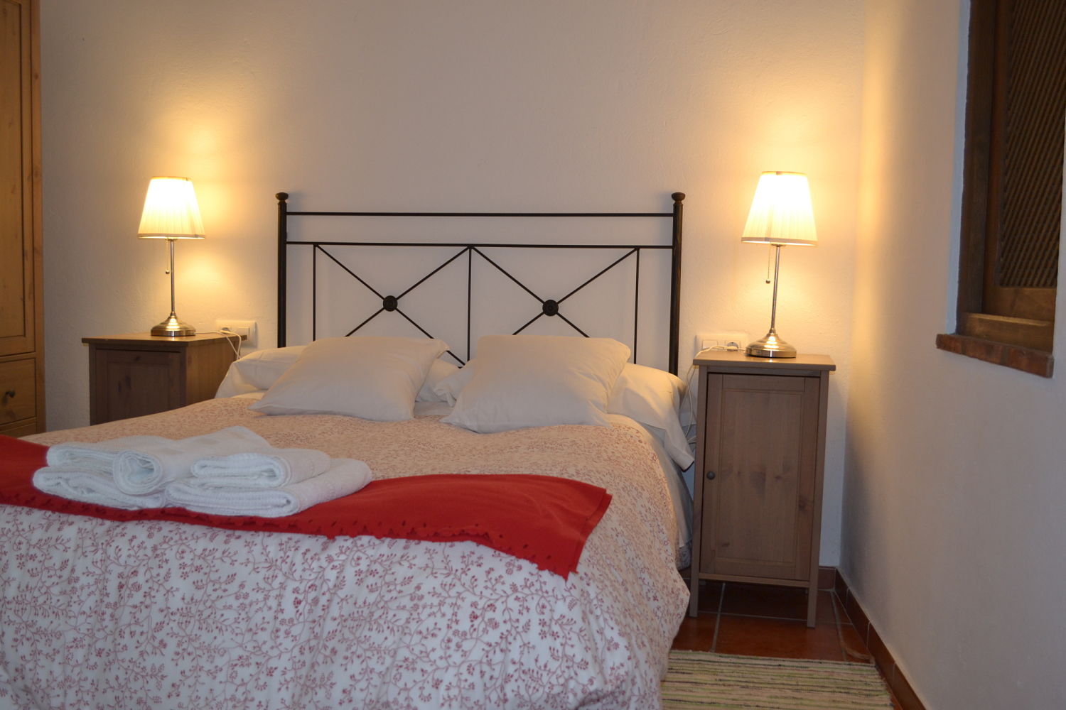 Tiene 50 m2. en una sola planta menos el cuarto de baño. Disponibilidad para 4 personas con posibilidad de poner cama supletoria y cuna. Entrada desde el patio de la casa al salón con ventana al patio con un sillón cama y entrada a la cocina-comedor y al dormitorio principal con cama de 1.35 cm con ventana al segundo dormitorio con una cama de 90 cm, cuarto de baño y desde la entrada al patio particular con ventanal al dormitorio. Desde la cocina-comedor se entra a la cueva habilitada como segundo dormitorio con cama de 90 cm.