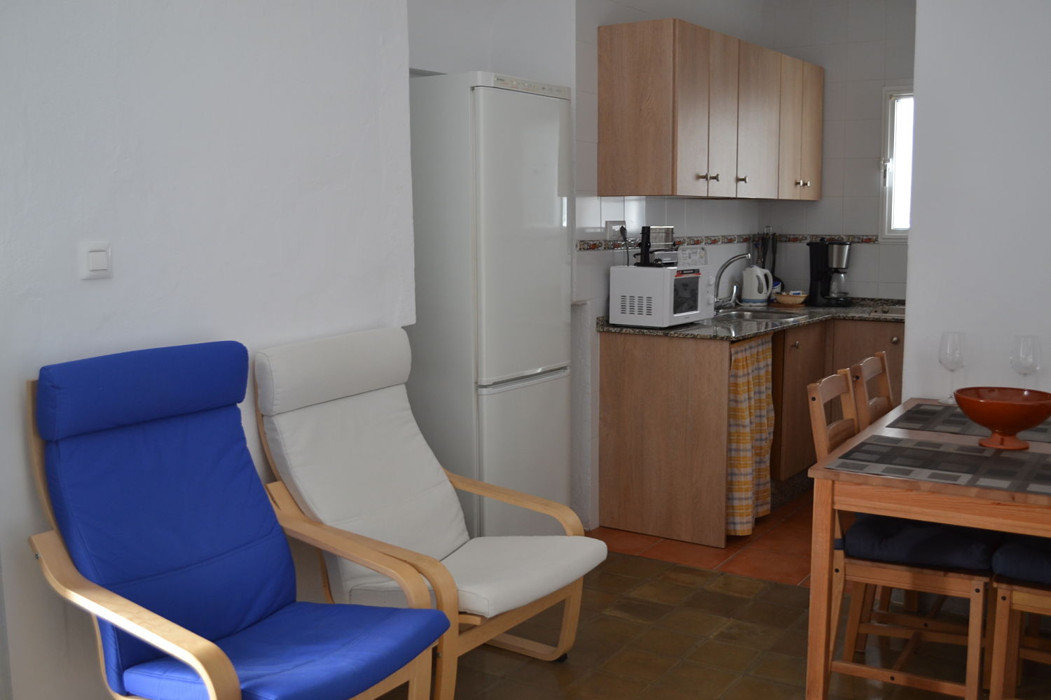 Tiene 50 m2 en una sola planta. Disponibilidad para 4 personas con posibilidad de poner la cama supletoria y la cuna. Se accede a él desde el patio de la casa subiendo unas escaleras. Se entra directamente al salón-comedor y cocina totalmente equipada. Entrada desde el salón al cuarto de baño y a los dos dormitorios el principal con cama de 1.50 cm. Y el segundo con dos camas de 90 cm. Ventanas que se abren en la cocina, dormitorio principal y cuarto de baño.