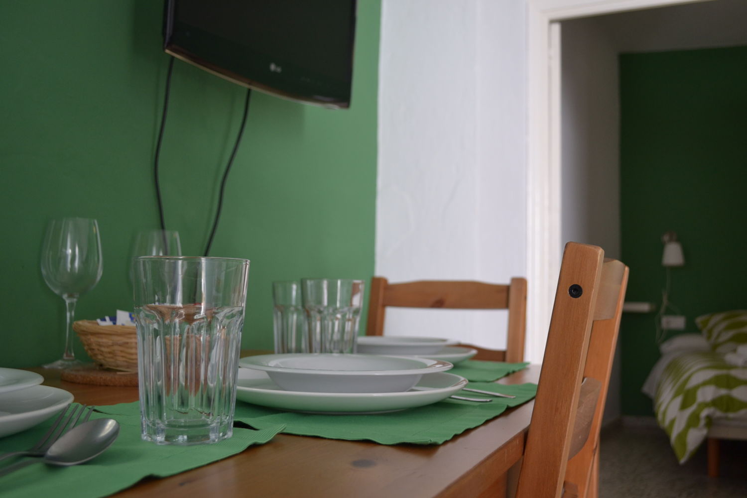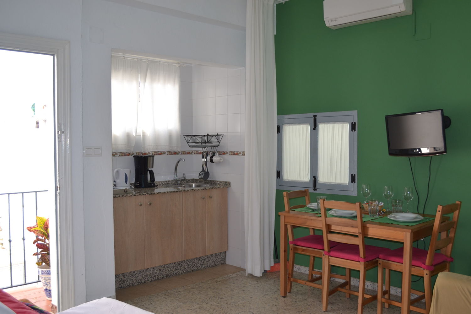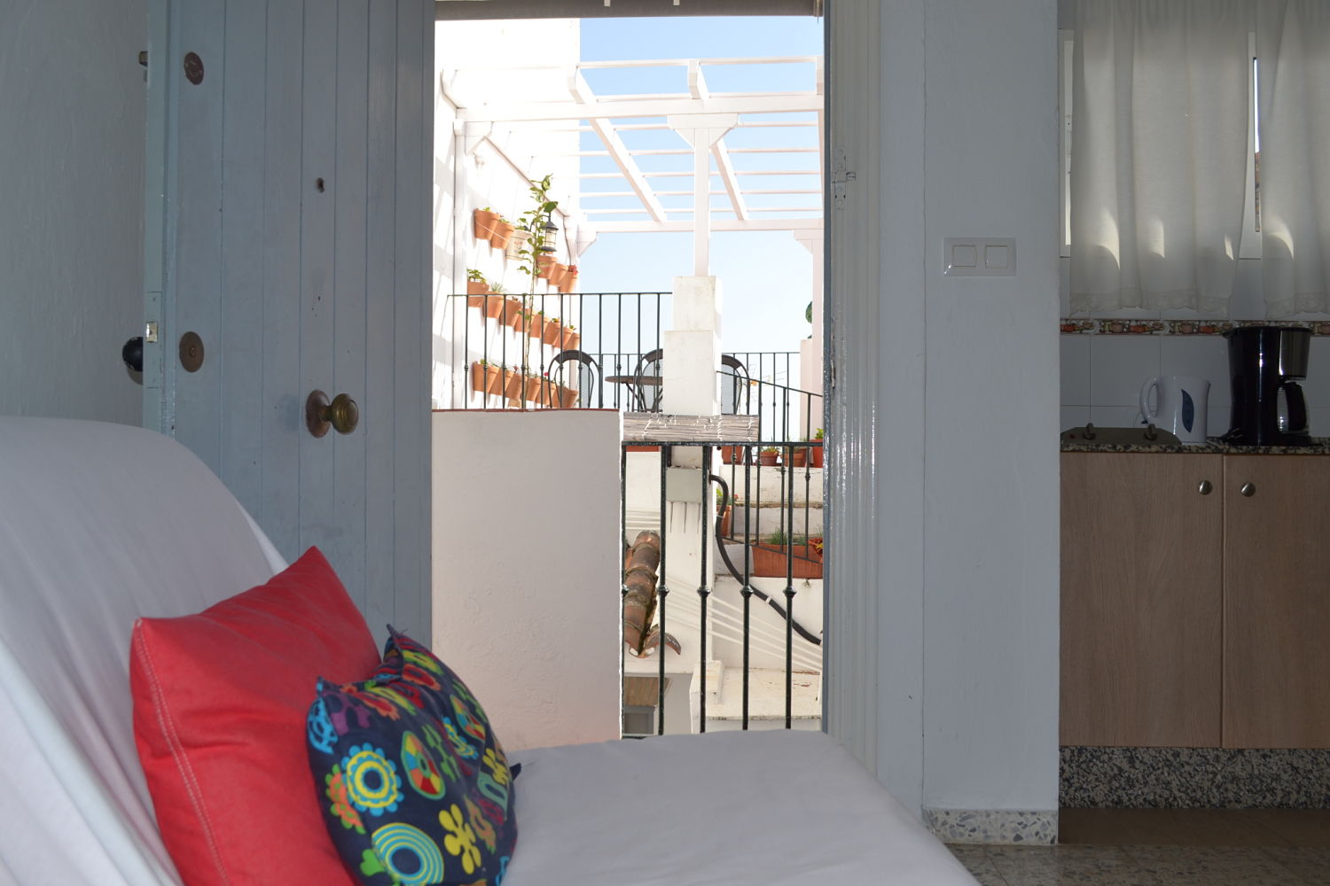 Tiene 30 m2 en una sola planta. Disponibilidad para 3 peronas con posibilidad de poner la cuna. Se entra directamente al salón-comedor con la cocina con ventana al patio de la casa, cuenta este con un sillón cama, ventana a un ojo de buey, el acceso al dormitorio con dos camas de 90 cm. y al cuarto de baño. Al apartamento se accede desde el patio de la casa y subiendo unas escaleras.