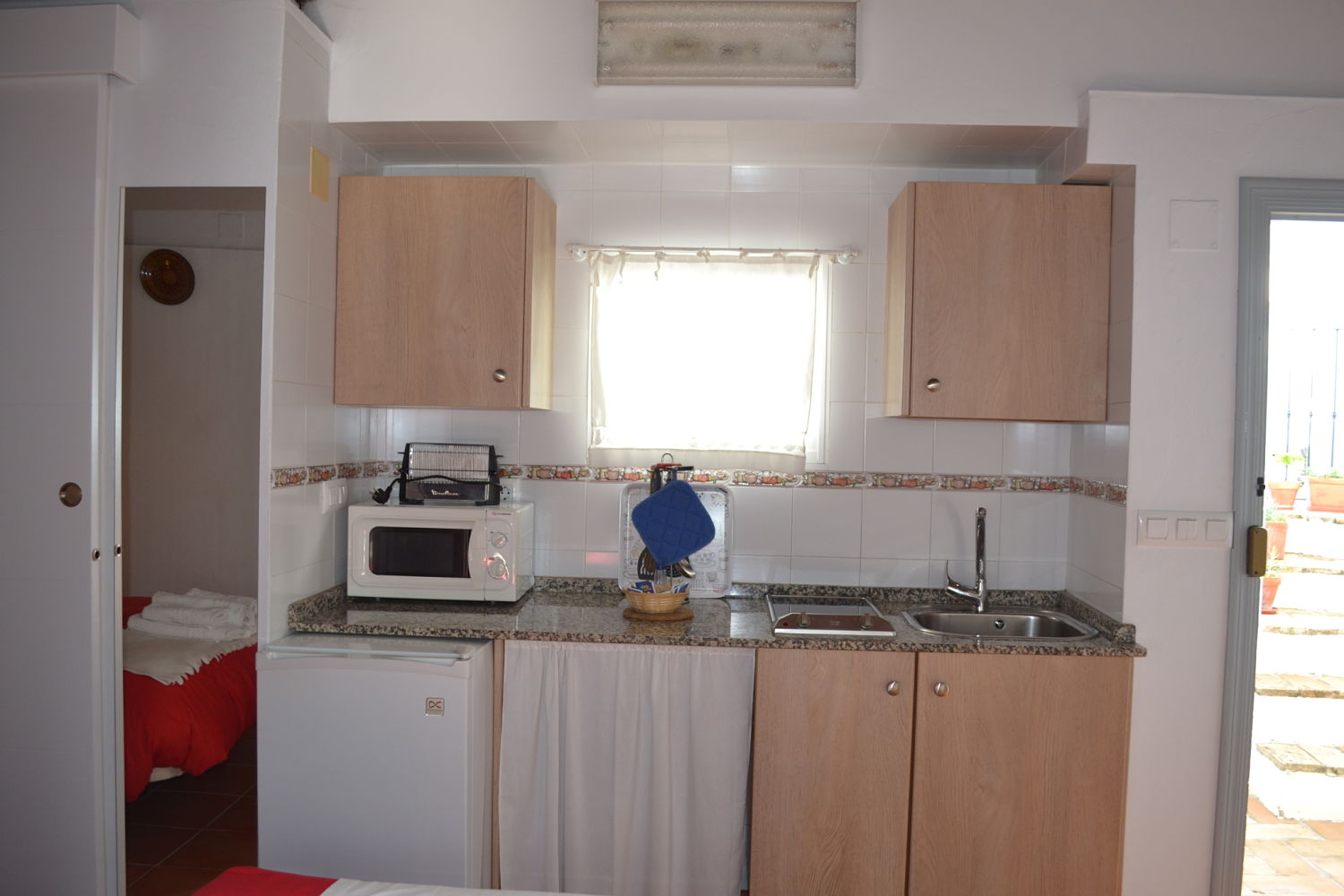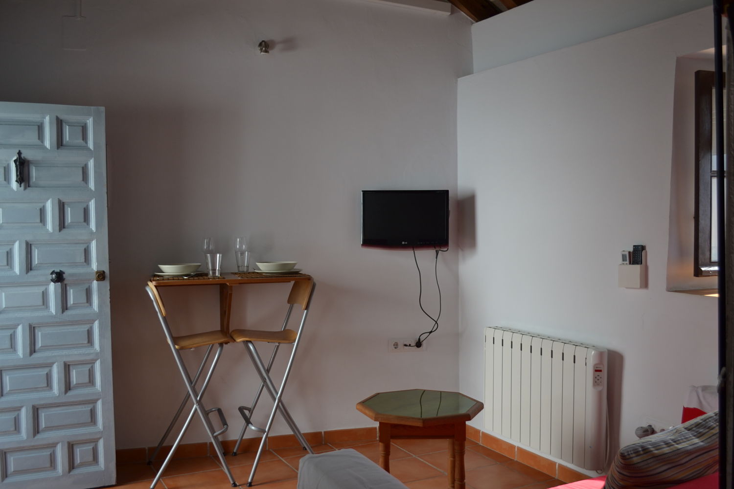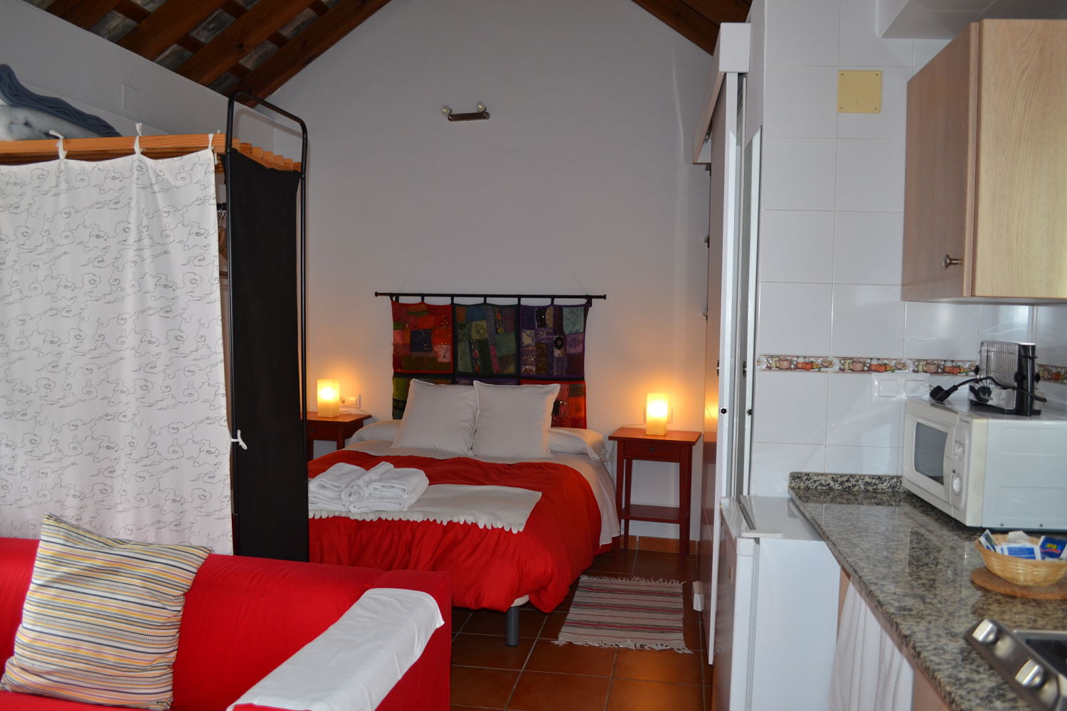 Tiene 23 m2. Es un loft habuardillado con techo de madera. Todo está en una planta menos el cuarto de baño que se accede por un escalón a través de una puerta corredera. Disponibilidad para 2 personas con posibilidad de poner la cuna. En una habitación está el salón-comedor-cocina-dormitorio con una cama de 1.35 cm. Tiene dos ventanas que se abren una da a la calle La Costanilla y la otra la de la cocina al patio de la casa y a la escalera por la que se accede a igual que la del cuarto de baño.