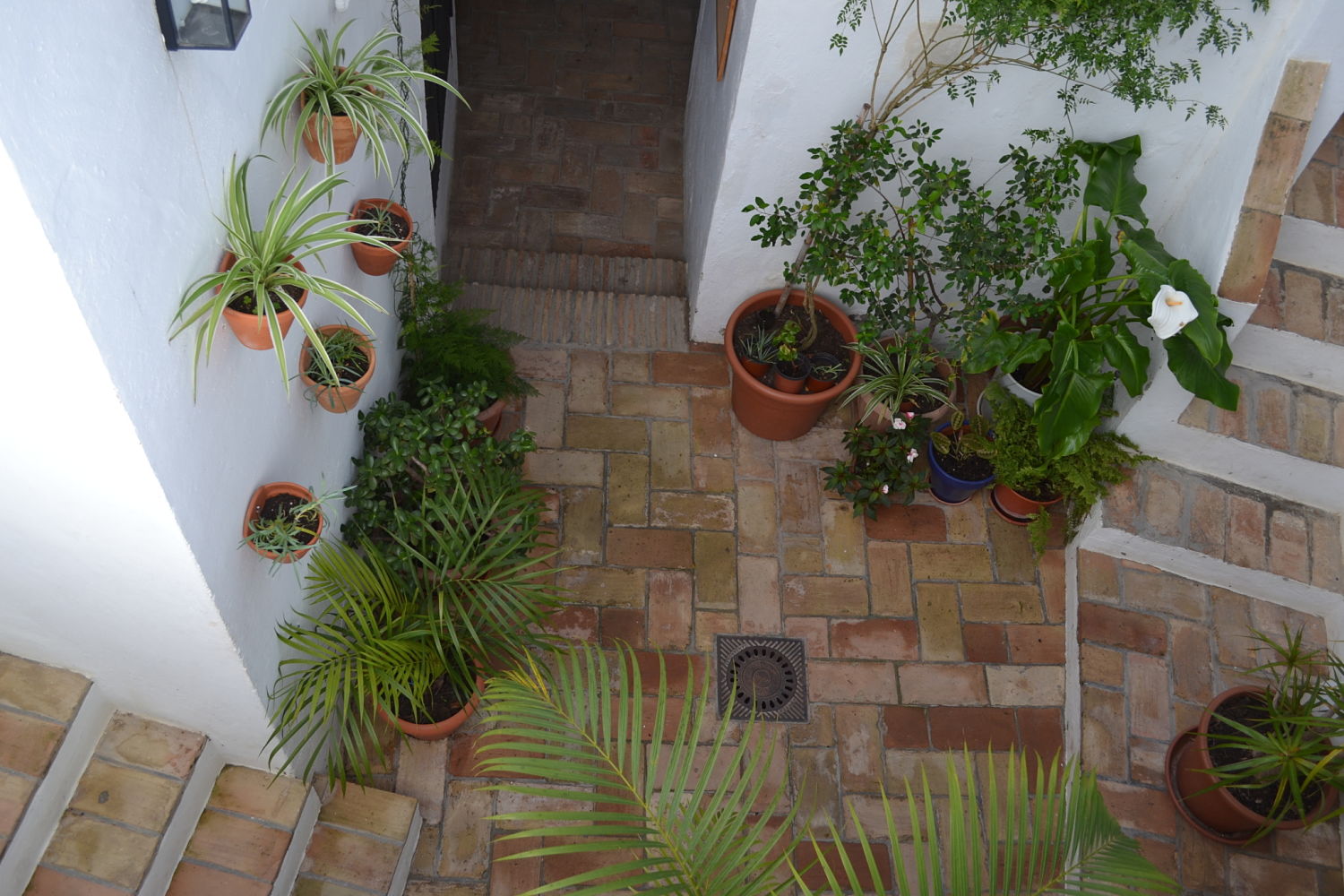 El patio se encuentra en el interior de la casa con el acceso a los apartamentos, las terrazas y a la lavandería. Es descubierto, con macetas de plantas y flores.